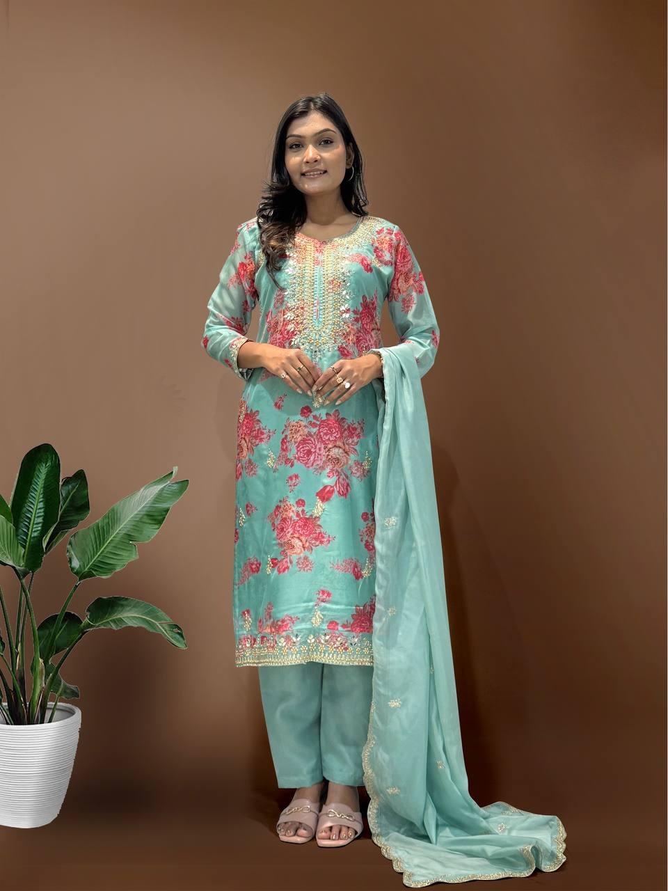 💥 *Presenting New Premium Kundan Organza Suit With Embroidery Coding Dori-Sequence With Heavy Stone Mirror Hand Worked Top-Bottom And Dupatta Set Fully Stitched Ready To Wear 🔥😍🥰*