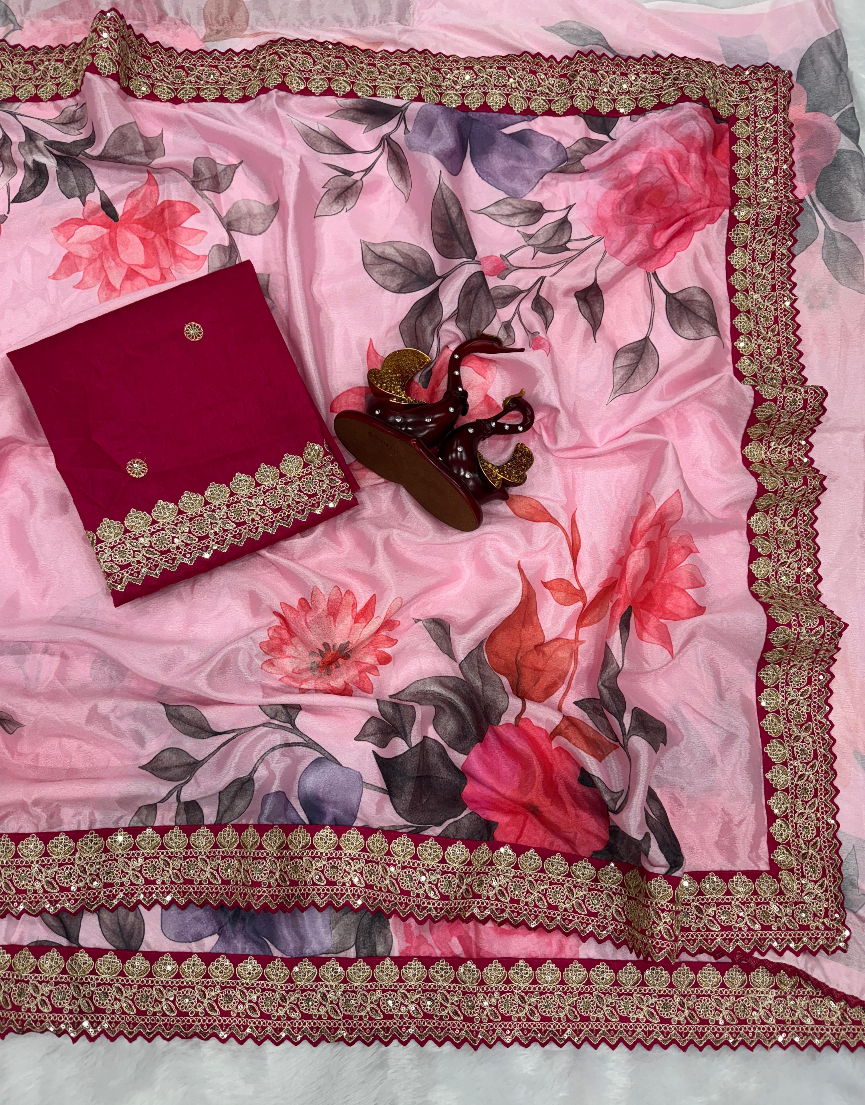 😍Unveil your inner fashionista with our stunning pink floral designer saree paired with the most sought-after Embroidery blouse in rich pink.